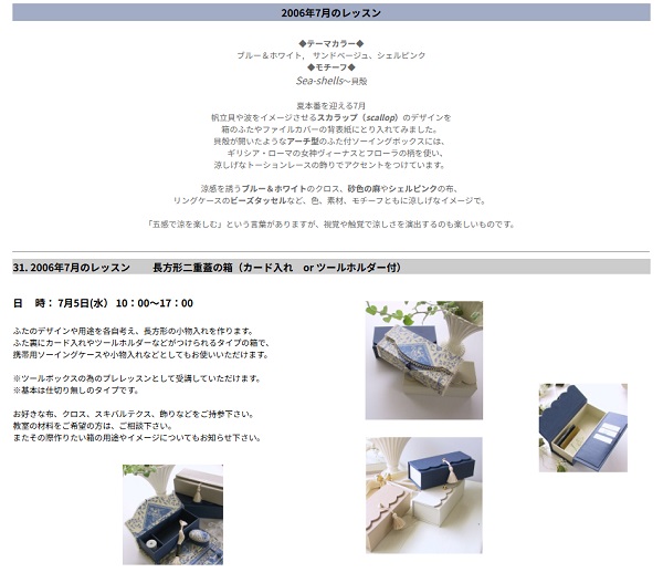 教室をスタートしてちょうど1年目の2006年7月。メインサイトの記録を見ると、「夏本番を迎える7月。帆立貝や波をイメージさせるスカラップ(scallop)のデザインを箱のふたやファイルカバーの背表紙にとり入れてみました...」と書いています。