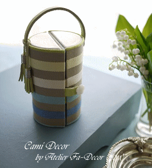 今年、2026年1月に撮影したSさんの作品(2025年12月に受講)。モリスを連想させる動植物モチーフの優しいミントグリーンの生地。同系色の水玉生地で柄をひきたたせ、世界に1つしかない半円の箱が仕上がりました。