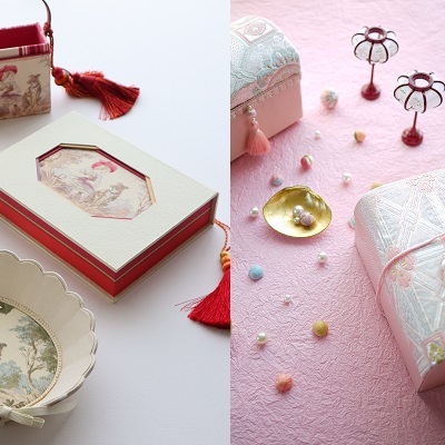 下は2009年からのカルトナージュの課題「Oval(オーバル)のフラワートレイ」のサンプルの1つ。同じモチーフの部分ですが、上の生地とは違う色です。