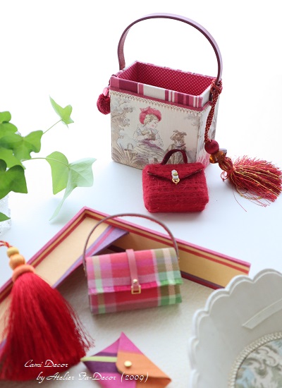 「ひな祭り」といえば、お人形やちいさなお道具。下の画像のバッグ類は、「貼って作るバッグと小物シリーズ」のアイテムをミニチュアで作ったものです。(作り方は大きなサイズと全く同じ)
