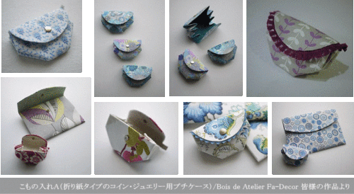 「縫わずに接着剤で貼って作るバッグと小物」より、手のひらサイズのプチケース。教室では「こものいれ(コイン・ジュエリーケース)A」というアイテムです。 以下、教室で受講された皆様の作品の一部を紹介します。 & … 続きを読む 縫わずに貼って作るこもの入れ2種-ジュエリー&コインケース
