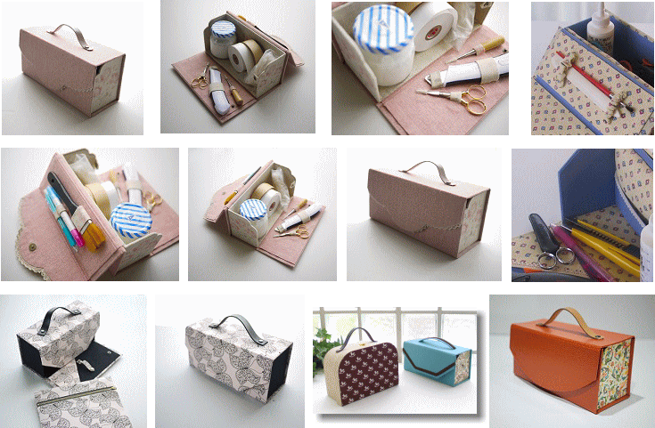 オープンにもなり、箱としても使えるような構造を・・・と考えた課題で、基礎テクニックの仕上げとなる作品です。内部のポケットなどは自由に考えていただき、3種類の金具のつけ方なども学びます。(蓋のデザイン、内部の箱などはご自宅で自由な発想で制作していただけます)