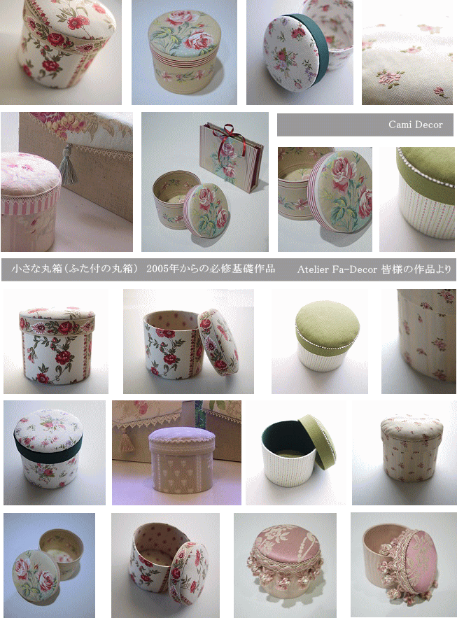 その後、レギュラーの方対象の基礎作品となりました。蓋がついた丸箱の基本のキを学ぶ必修の課題で、一番シンプルな方法で制作します。(蓋付のハートの箱、2段の丸箱、マカロンポーチ、楕円のかぶせ蓋などの前の必修作品)