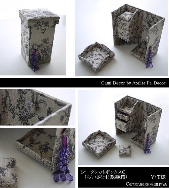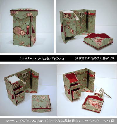 課題の候補(作品画像)連絡用 2026年4月 K様 ① ② ③ ④ シャーベットカラーのフリンジ付の箱とリボン飾りのシルクフレーム(2007/2008年) ——————————————————————————————————————————– カルトナージュのちいさなお裁縫箱-シークレットボックス(秘密の箱) 皆様の作品より 関連投稿: 可愛いビスクドールとトランクケース|教室の皆さまの作品より カルトナージュのちいさな裁縫箱 受講された皆様の作品 ひな祭りによせて-女の子のイラストが入ったフレームの箱 チョコレート色のハートの箱(入れ子式のハートのカルトナージュBOX) Season’s Greetings(2024年)-良いお年をお迎えください 紙で作るディスプレイボードと、シャビーシックの円形フレーム ピンクの薔薇と緑の薔薇-大きな収納・小さな箱 雪山リゾートの楽しみ-シークレットボックスA ハートのシザーキーパーとひし形のピンクッション(2007) 蛇腹のファイル各種 基本タイプ(ポストカードサイズ)&応用の課題 Ovalトレイ・大きめサイズ(蓋付きの箱にもなる角丸長方形のトレイ) ペーパートランクA(2007年より) オリジナル リングケース(2007年夏より/基礎課題) 紙とスキバルで作るペンケース(2005年)皆さまの作品より 課題の候補(作品画像)連絡用-2025/10月・11月クラス Y様 ロールアップホルダー(芯入り/芯無し)