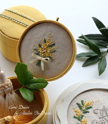 ずいぶん前に作ったミモザの刺繍がテーマの丸いトランク。ずっと紹介しようと思いながら、機会を逃していたもので、教室の隅にひっそり置いてあります。