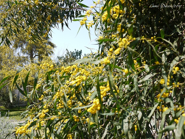 旅先で訪れた美術館の庭のミモザの写真。葉が細くて長いフロリバンダという品種のようです。