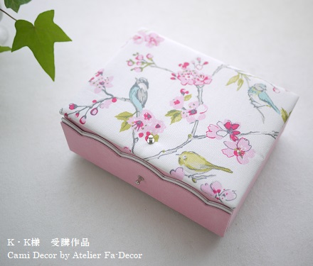 今の時期にぴったりな、春らしい桜と小鳥の柄の生地を使ったKさんの受講作品を紹介します。