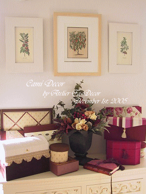 額の絵はイタリアの版画の赤唐辛子。作品は茶色やボルドーなどの秋色。この頃は季節に合わせて作品を飾っていたのでした。